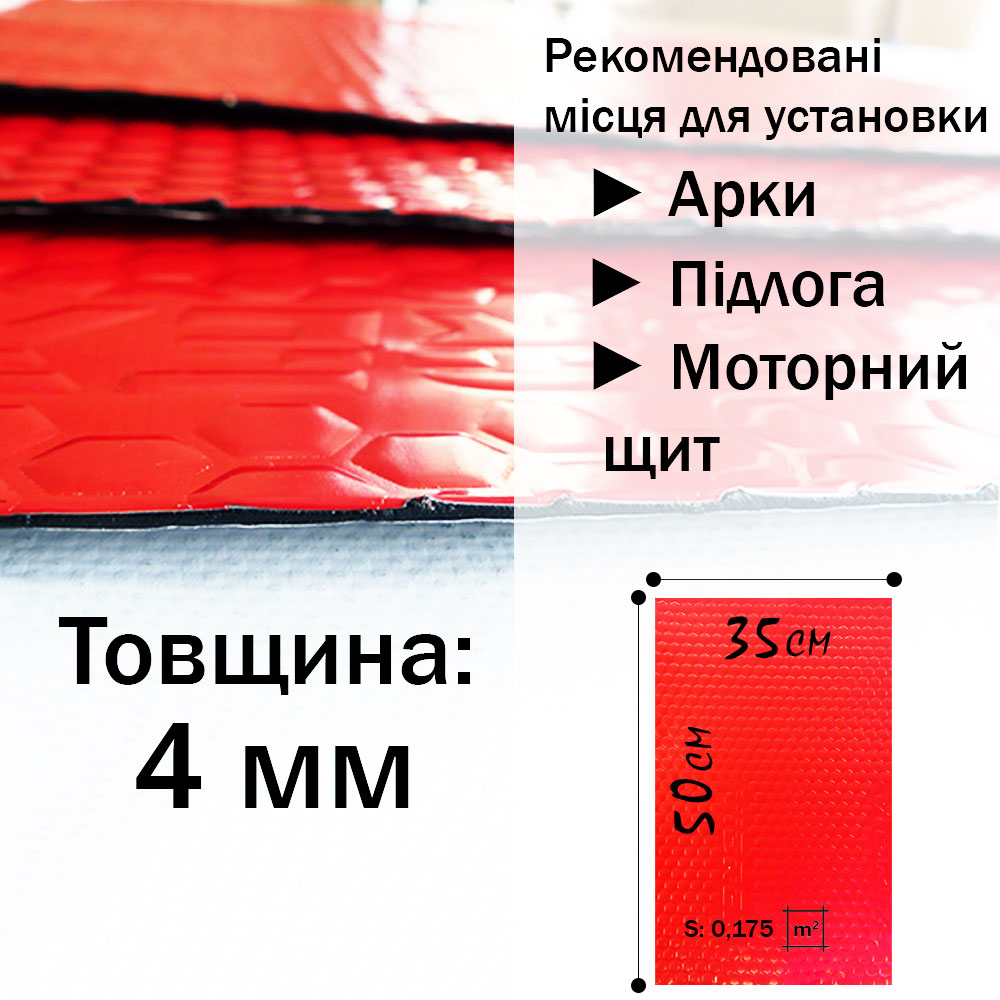 Толщина 4 мм в сочетании с эффективной мастикой позволяет поглощать сильные вибрации и снижать дорожный шум даже в самых нагруженных участках кузова.