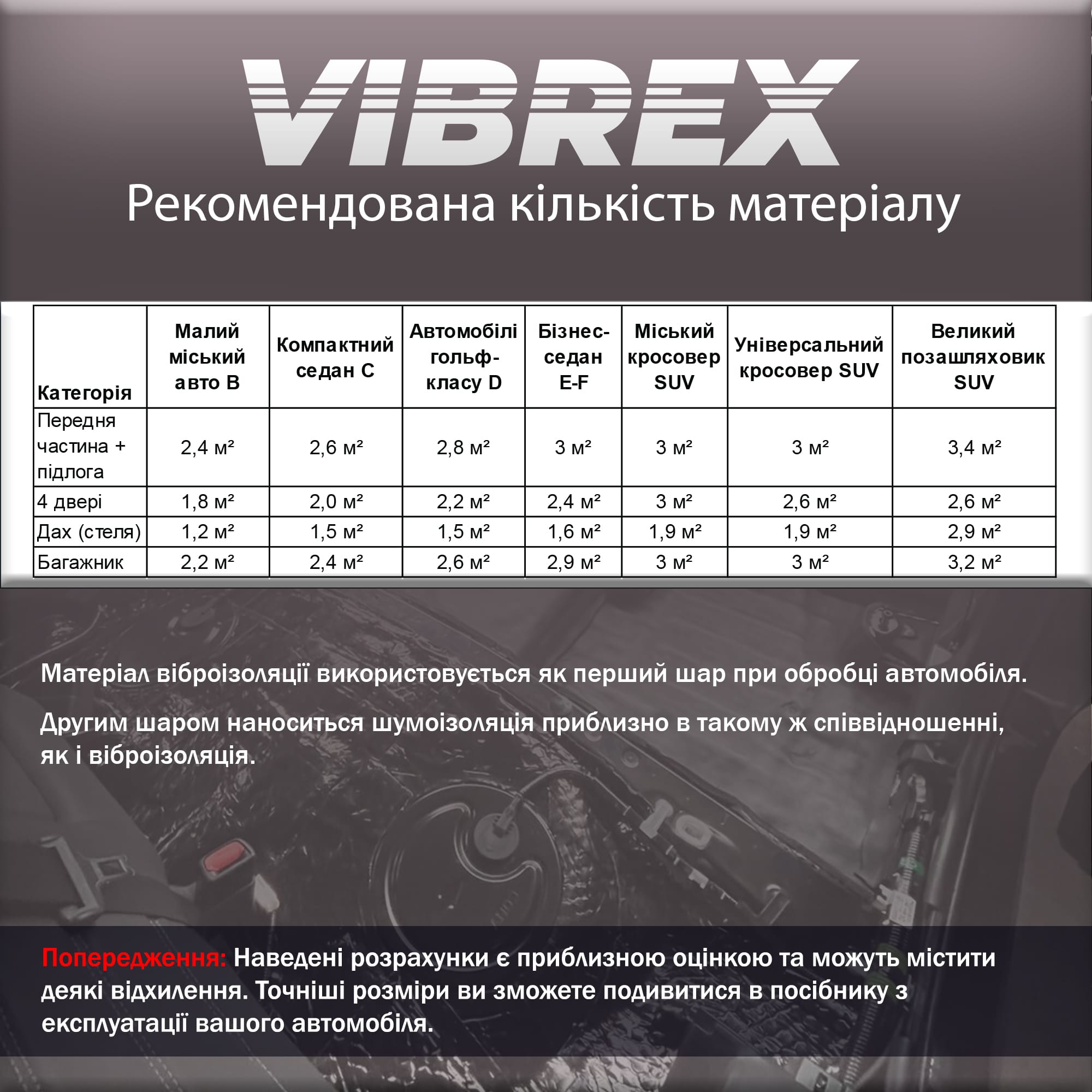 Віброізоляція 4 мм (Vibrex Standard) ефективно знижує рівень шуму та вібрацій, що проникають ізнизу — через арки, підлогу та багажник.